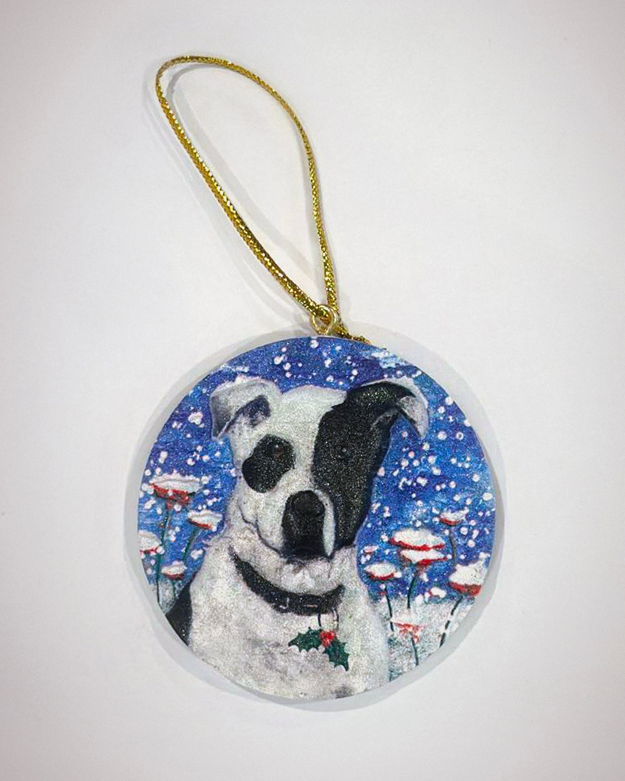 ホリデーをふわふわの相棒と一緒に祝おう!『Mooh』は、JDが愛した犬ムーのポートレートに、お祝いのサンタ帽をかぶせたチャーミングなオーナメントです。展覧会で見せたムーのユニークな個性と存在感にインスパイアされたこの飾りは、ツリーに温かさと喜び、そして遊び心を添えます。犬好きやJD作品のファンにぴったりの、ペットが私たちにもたらす無条件の愛を思い起こさせる心温まる一品です。